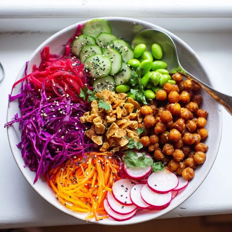 - Top each bowl with roasted chickpeas, crispy rice puffs or cornflakes, pumpkin seeds, and sliced radishes.