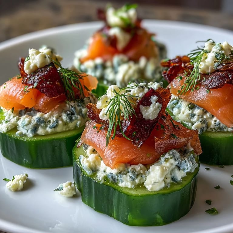 Save Experience the crisp freshness of summer with these elegant cucumber bites. Each round features a smooth, creamy dollop of dill-infused cream cheese paired beautifully with savory smoked salmon, creating a light yet flavorful appetizer perfect for gatherings and warm evenings.