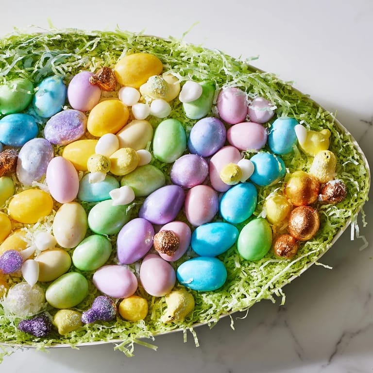 Large egg-shaped platter or tray Small bowls for sorting candies optional Parchment paper if shaping manually