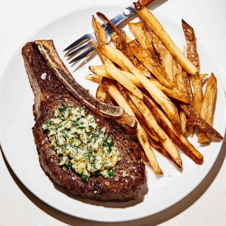 Save A classic steakhouse favorite featuring perfectly seared steak topped with rich garlic-herb butter, served with crisp golden fries.