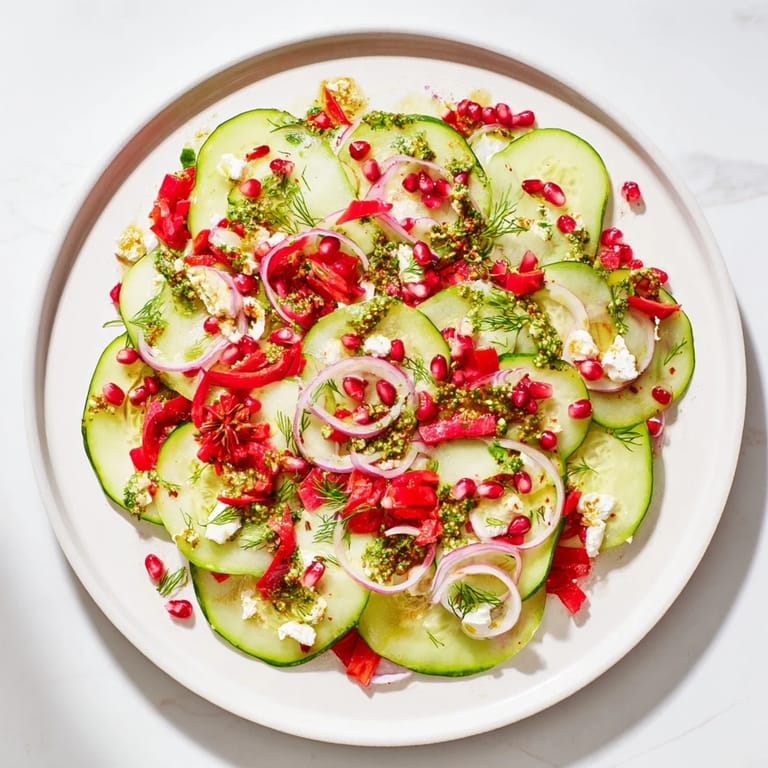 Save A fresh, festive salad featuring crisp cucumbers, vibrant pomegranate seeds, and a tangy citrus dressing—perfect for holiday gatherings.