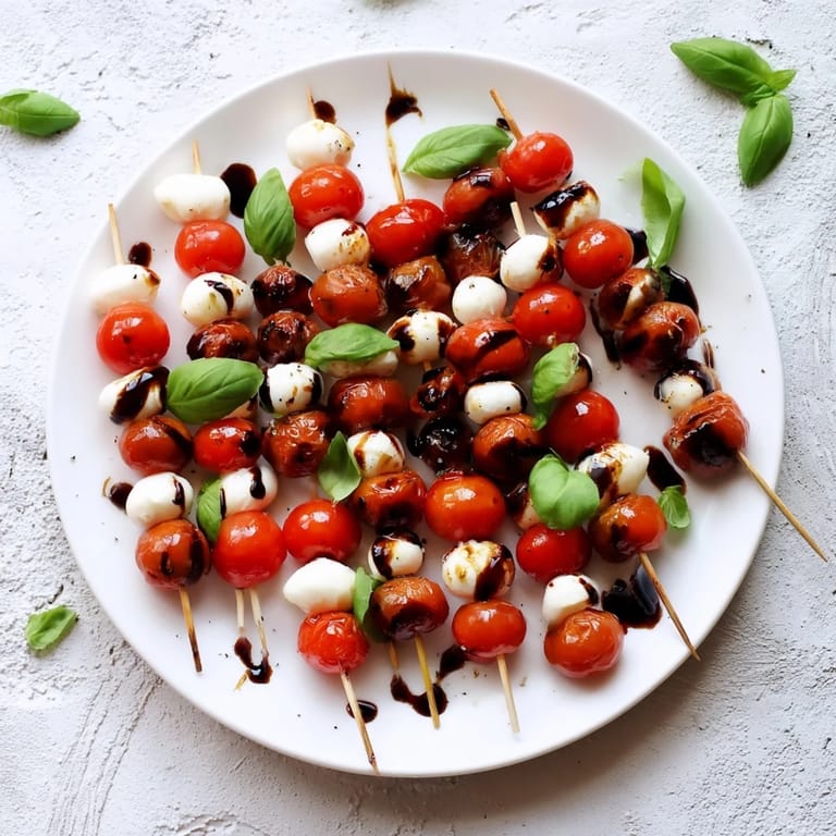 For added color use a mix of red and yellow cherry tomatoes. To make ahead assemble skewers and refrigerate without dressing; add oil and glaze just before serving. Pair with a crisp white wine like Pinot Grigio.