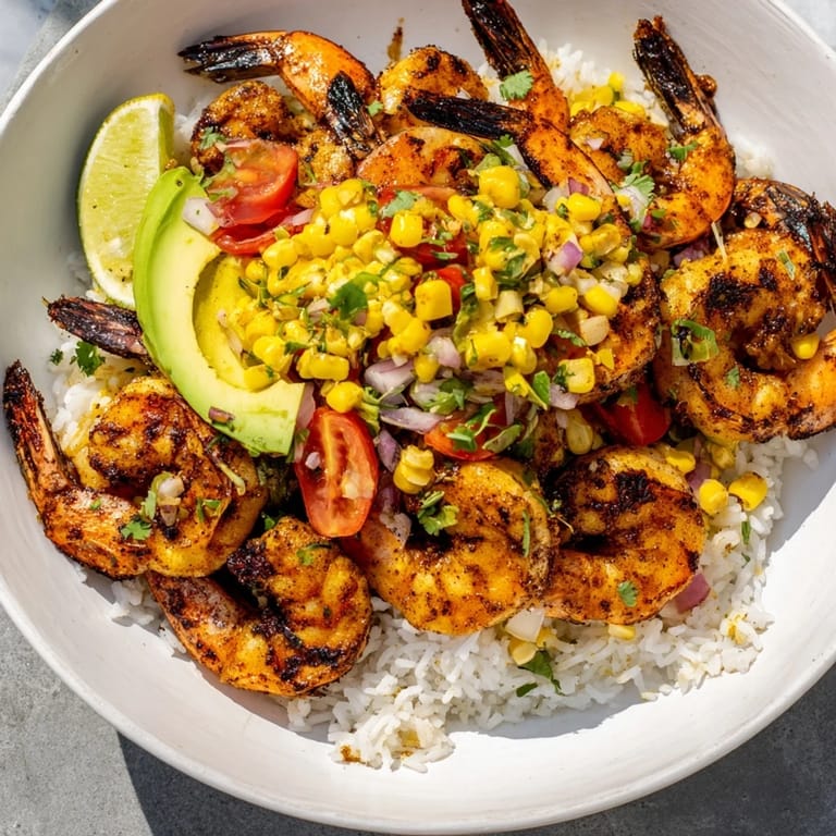 A fresh and vibrant bowl featuring juicy grilled shrimp, creamy avocado, sweet corn, and zesty lime over fluffy rice—a perfect light meal for summer.