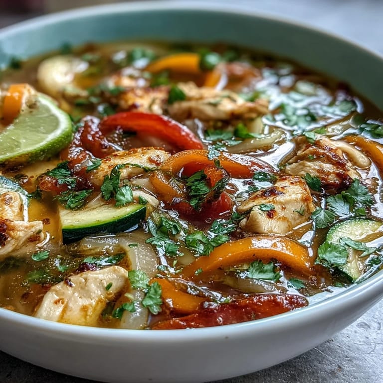 Light and flavorful soup with tender chicken, bell peppers, zucchini, and fajita spices, perfect for a wholesome meal.