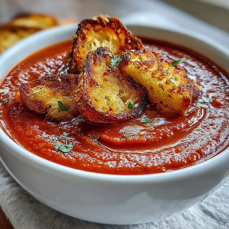 This vibrant roasted tomato soup transforms fresh tomatoes through high-heat roasting, concentrating their natural sweetness into a luxurious velvety base. The addition of caramelized onions and aromatic garlic builds deep savory undertones, while the vegetable broth adds essential depth. Finished with optional cream for extra richness, each bowl gets crowned with golden homemade croutons seasoned with garlic and olive oil. The entire process takes just one hour from start to finish, yielding a warming vegetarian dish that delivers restaurant-quality results with minimal effort.