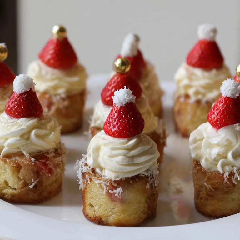 Save Festive, bite-sized bread pudding treats topped with whipped cream and strawberries to resemble Santa hats perfect for holiday gatherings.