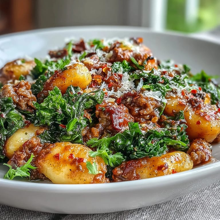 Save Tender gnocchi tossed in a rich, spicy sausage sauce with wilted kale for a hearty, comforting weeknight meal. This dish brings together bold Italian-inspired flavors and simple preparation, making it a perfect solution for busy evenings when you crave something satisfying and flavorful.