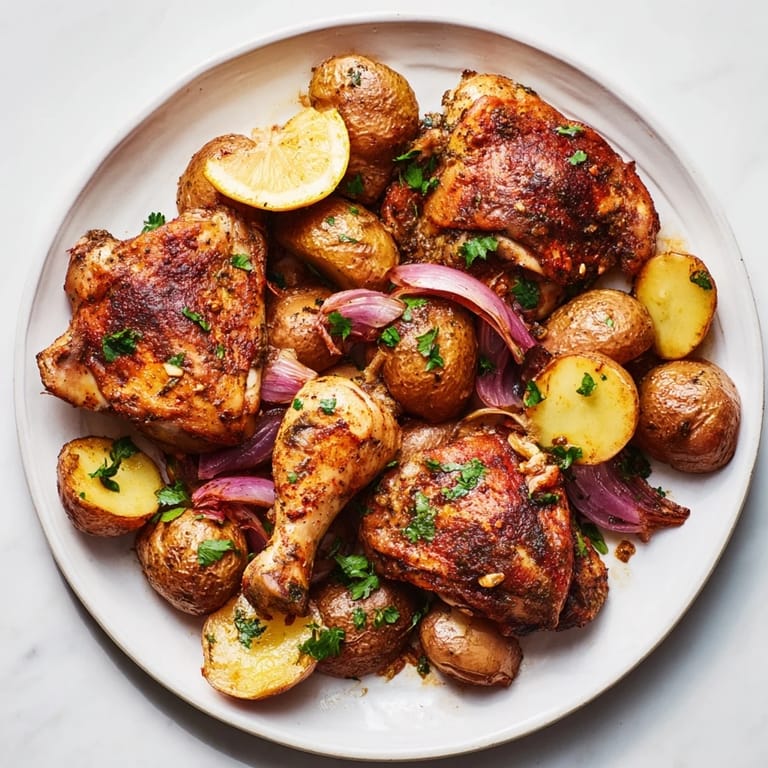 Save A vibrant, Middle Eastern-inspired sheet pan dinner featuring juicy zaatar-spiced chicken thighs and crispy roasted potatoes, all cooked together for maximum flavor and minimal cleanup.