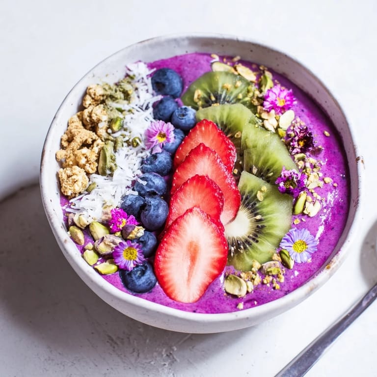 - Toppings: 1/4 cup fresh berries (blueberries, strawberries, or raspberries), 1 kiwi, peeled and sliced, 2 tbsp granola (gluten-free if needed), 1 tbsp chopped pistachios, 1 tbsp unsweetened coconut flakes, Edible flowers or microgreens (optional)